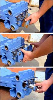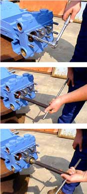 Step 1 Approximately 2 feet of clearance is required between the front of the pump fluid cylinder and any obstructions to service the piston cup seals. If there is insufficient clearance, the pump must be relocated to an area where adequate clearance exists. Step 2 To access the piston cups seals, the valve cover clamps must be removed. Standard pump models have individual clamps for each cylinder. For these pumps, remove the six (6) diagonal nuts that hold the three (3) bar clamps in place, then remove the cylinder covers. Do not remove the two (2) nuts on the opposite corners of the fluid chamber, as they will keep the fluid cylinder securely mounted on the pump during this operation. Step 3 Some pumps may be equipped with a single cover plate that secures all three (3) cylinders. For these models, all eight (8) fluid chamber nuts must be removed to facilitate removal of the cylinder covers. Step 4 Using a socket wrench with a long extension, remove the packing nut from the piston assembly. This nut secures the piston assembly to the crosshead rod. Step 5 Once the packing nut has been removed, use the FMC Technologies piston tool (A5049) to pull the piston assembly from the liner. Insert the FMC piston tool inside the cylinder until flush with the face of the slotted piston retainer nut. Twist the tool to engage and lock the tabs of the tool inside the mating slots in the retainer nut. Step 6 Pull the piston assembly free of the pump using a combination pulling and twisting motion. Step 7 Place flats on the bottom of the piston holder in a vice or clamp to secure. Using the FMC Technologies piston tool, unscrew the piston retainer nut and remove. The piston and packing washer may now be removed. Step 8 Inspect all parts for damage or unusual wear. Insure that the interior surface of the piston liner is smooth and free of cracks and grooves. New piston seals will fail prematurely if installed in liners with damaged bores. FMC Technologies strongly recommends that all 3 piston seals be replaced, not just those that show signs of leakage, whenever this type of service is performed. This will insure maximum operational time between service intervals. Step 9 Reverse the previous steps to rebuild the pump. FMC Technologies recommends that all seals or gaskets that are disturbed during service procedures be replaced. This includes the seal holder o-ring that is located on the crosshead rod directly behind the piston assembly. Step 10 Insure that all fasteners are tightened to the values specified in the Fastener Torque Requirements.